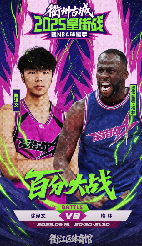 雷速体育9月6日讯 此前,星街战官方公布勇士球星格林的百分大战对手为陈泽文,双方比赛将于9月19日20点30分—21点30分进行。